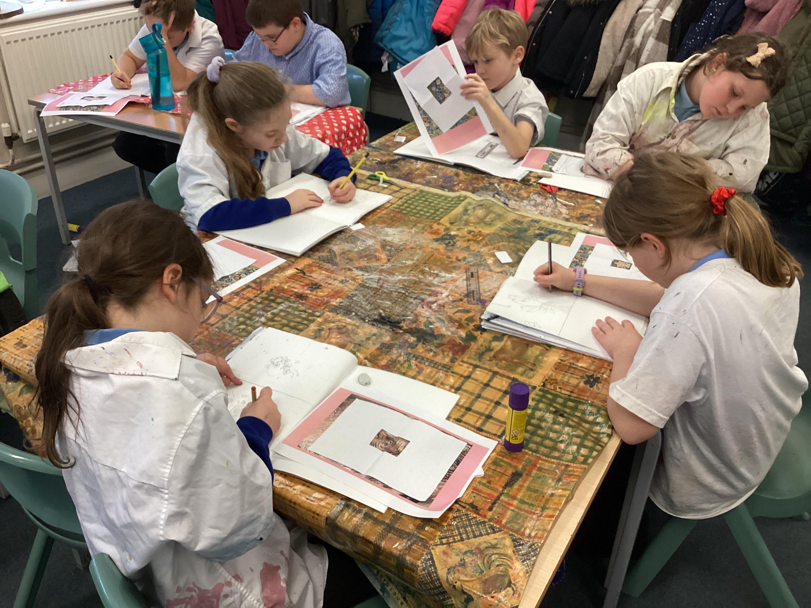 This week the children have been exploring drawing and painting in art. We have looked at linear lines within feathers and shells, and intricate patterns in lace. We have also looked at concentric circles by Kandinsky, and the children have created our own interpretation by exploring pebbles within pebbles.